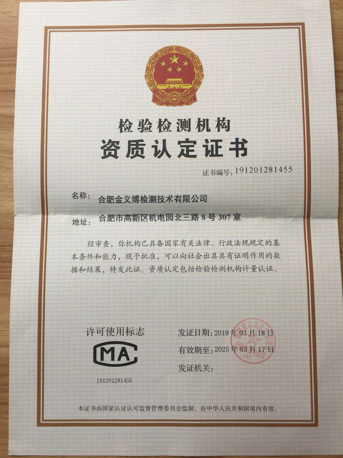 热烈祝贺金义博一合肥检测公司取得国家授权的第三方检测证书(CMA)!
